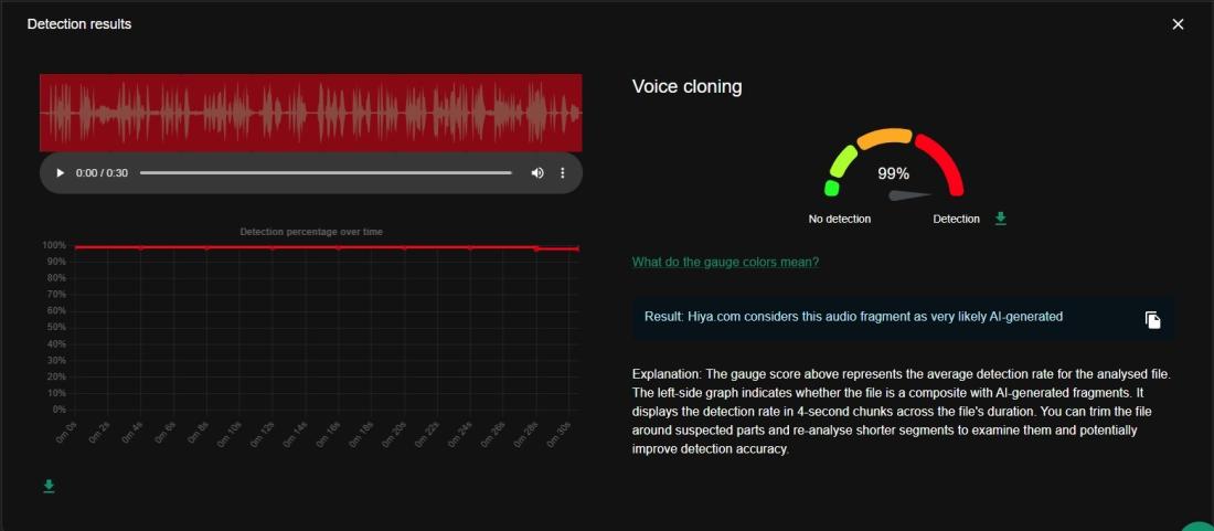 We analysed the X clip's audio using the Hiya voice cloning detection tool, which suggested a 99% probability that the audio was AI-generated.