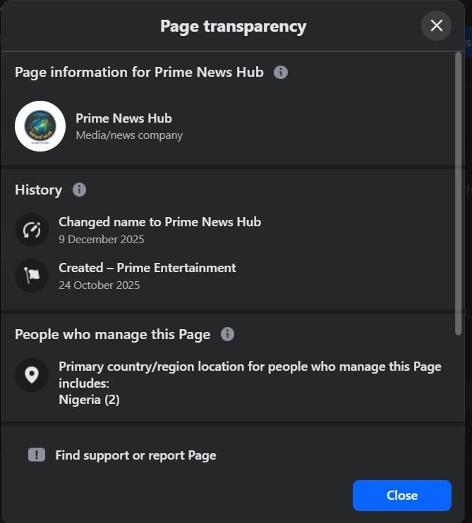 A Facebook keyword search for the name led to a page that now operates as "Prime News Hub". The page transparency section shows its name was changed on December 9, 2025.
