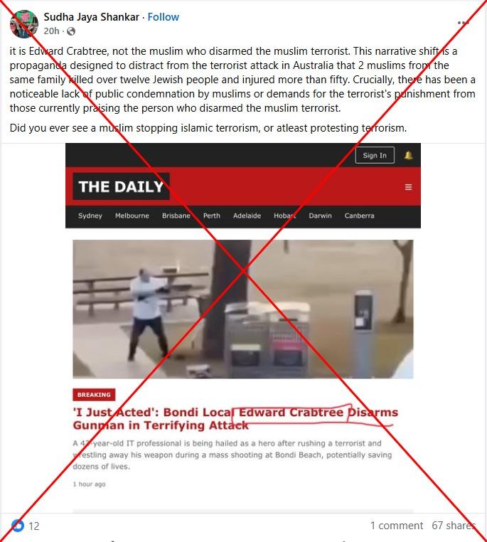 "It is Edward Crabtree, not the muslim who disarmed the muslim terrorist," reads part of a Facebook post shared December 15, 2025.