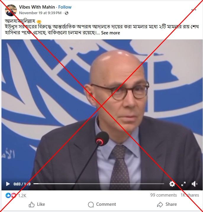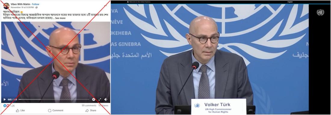 The first part of the video in the false post corresponds to the 22:00-mark of the video, where UN human rights chief Volker Türk said the Bangladesh government can refer cases that are "difficult to prosecute" to the International Criminal Court (archived link).