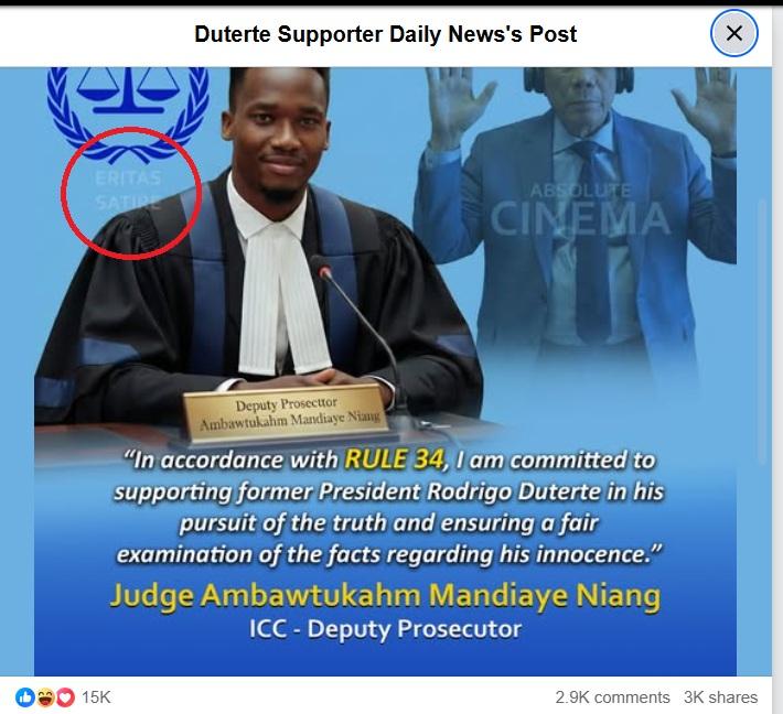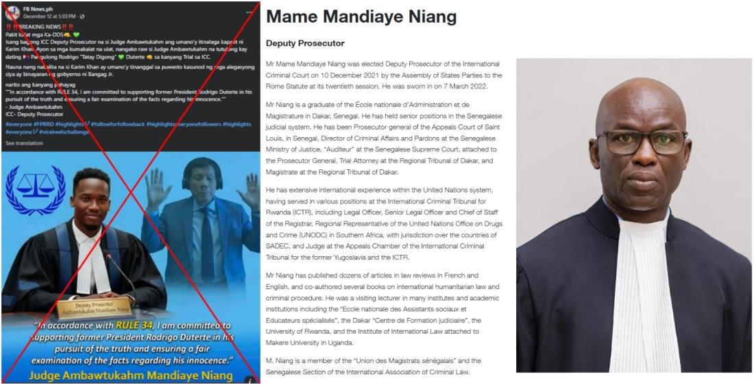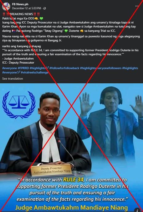 "A new ICC deputy Prosecutor who is Judge Ambawtukahm mandiaye Niang was the one assigned to replace Karim Khan. According to reports, Judge Ambawtukahm promised to help former president Rodrigo Duterte in his trial at the ICC," reads part of a Tagalog-language Facebook post labelled as "breaking news", which was shared on December 12.