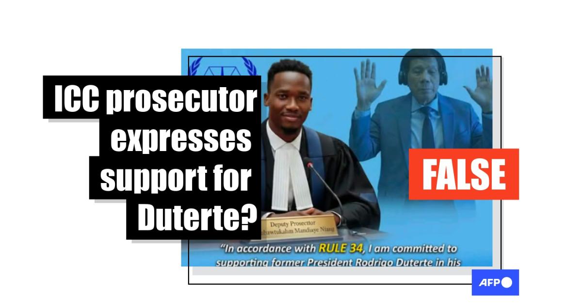 Former Philippines president Rodrigo Duterte, charged with crimes against humanity, will remain in custody after the International Criminal Court (ICC) rejected in November 2025 a request from his defence team for release on medical grounds. Social media posts shared a made-up quote from a fictitious ICC deputy prosecutor saying he will support Duterte in his case. The Office of the Prosecutor told AFP no such statement was issued and the claim was traced to a satirical post.