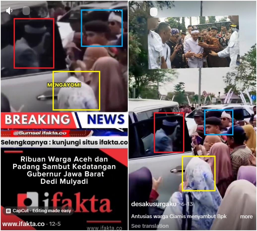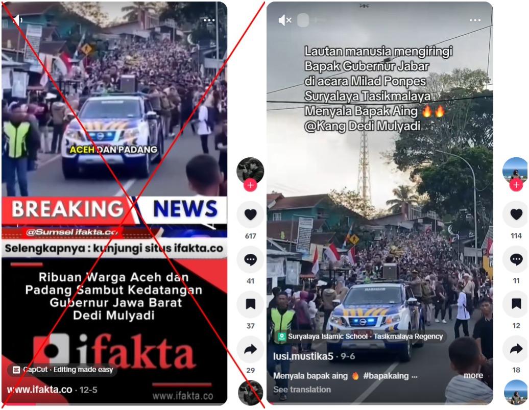 A subsequent keyword search found a TikTok video showing the same scene in the other clip was shared on June 13 -- months before the disaster in Sumatra -- with the same people in the false video (archived link). The clip was uploaded a day after Dedi's visit to the province's Ciamis Regency to celebrate its 383rd anniversary (archived here and here).