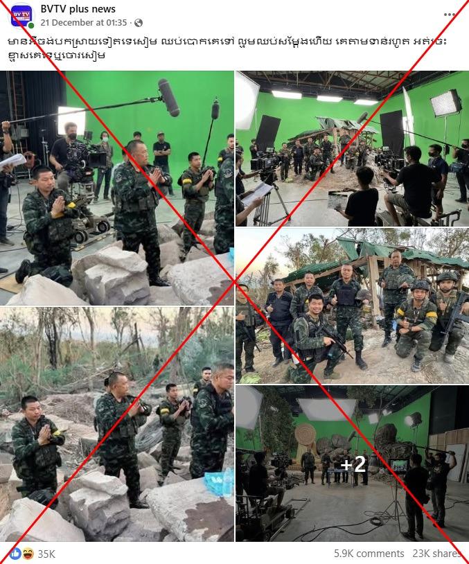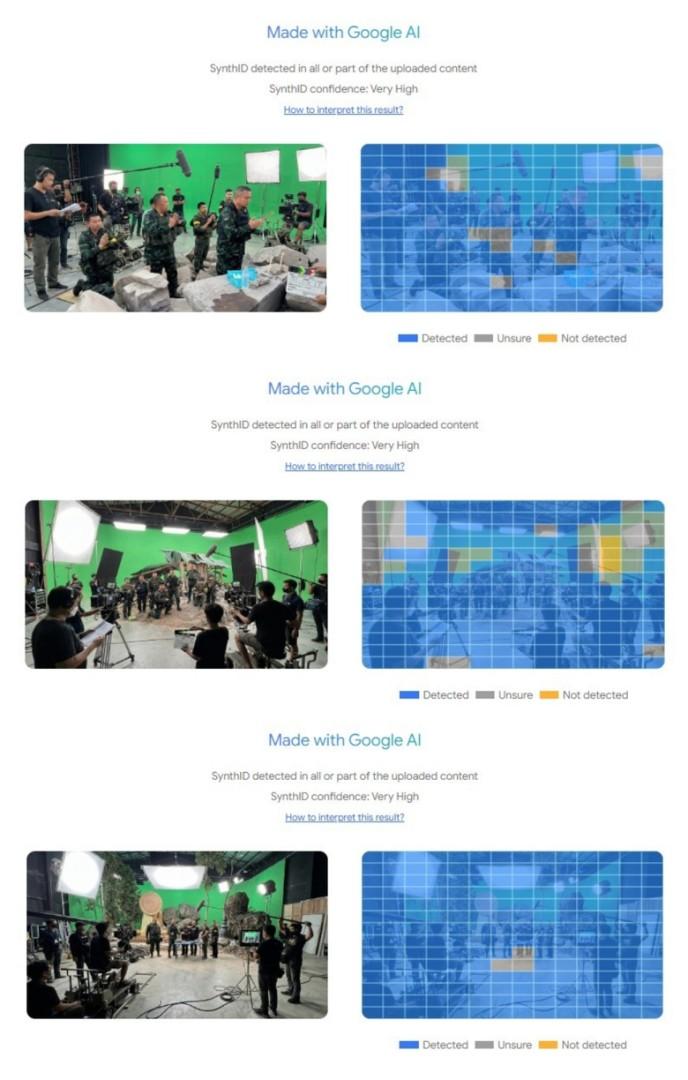 After Thai media reported the country's army had retaken a temple on the disputed border with Cambodia, images were shared in Khmer-language posts falsely claiming Thailand's military had staged pictures of their troops using a studio and green screen. The images were flagged as having been made with Google's AI tools, and contain visual errors indicative of fabricated content.