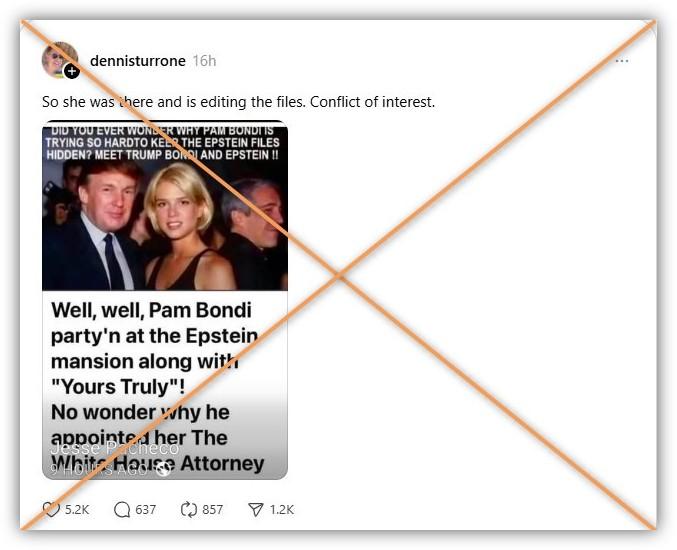 The posts -- and others like them shared on Facebook and X -- appear to show an old picture of Trump and a young woman that resembles Bondi posing for a camera. Epstein, who died by suicide in 2019 while awaiting trial on sex trafficking charges, is seen standing behind them.