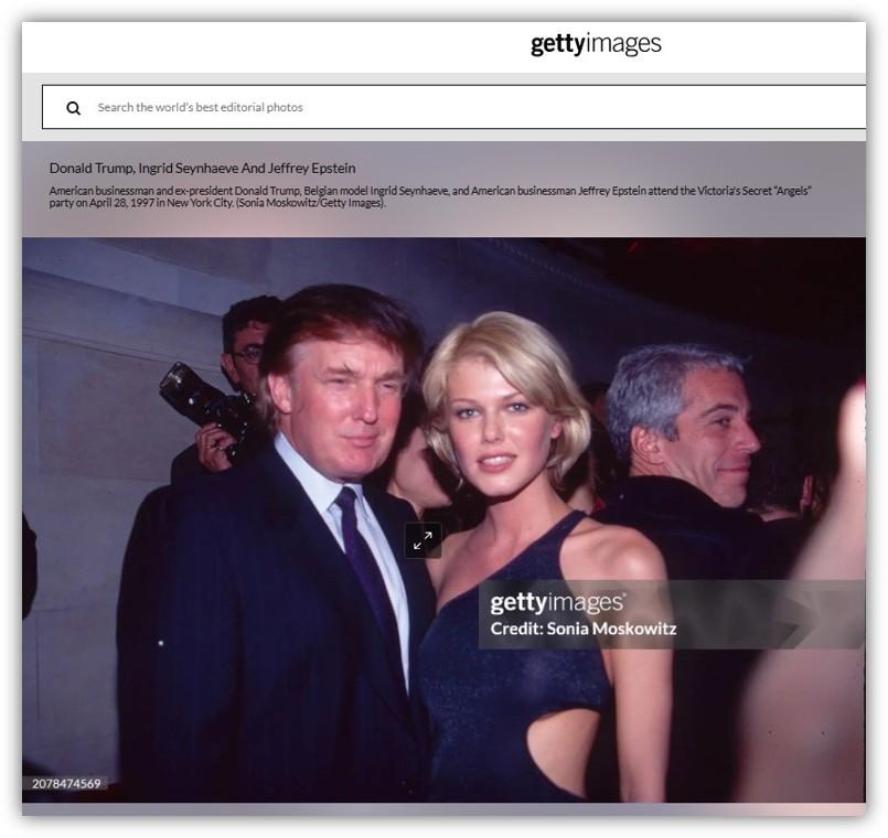 Reverse image searches surfaced the original photo in Getty Images's catalogue, with a caption saying it showed then-businessman Trump and Belgian model Ingrid Seynhaeve, with Epstein behind them, at a 1997 Victoria's Secret party in New York City (archived here). The picture has been widely published.