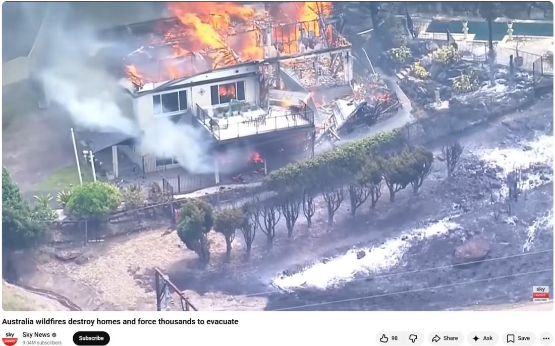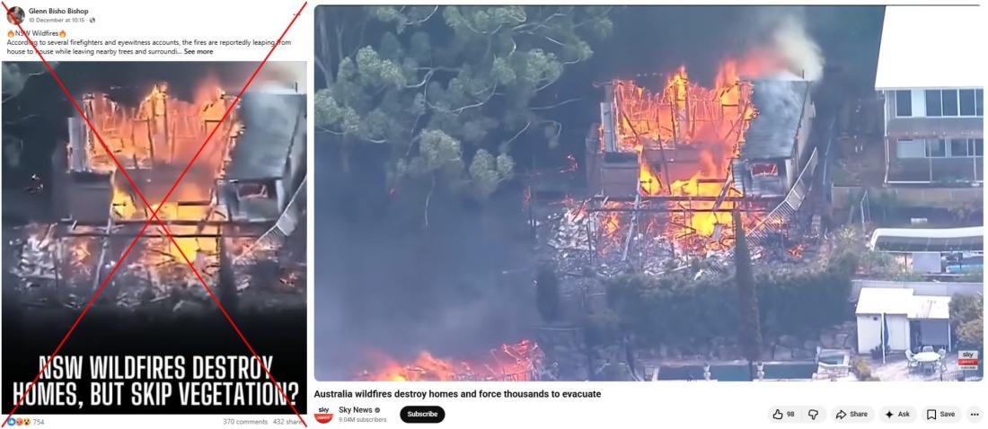 A reverse image search revealed that the circulating picture is similar to Sky News footage of the bushfires in Koolewong published on December 7, where the burning house is shown around the 15-second mark (archived link).