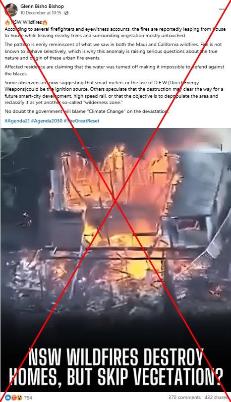 The post, which was shared more than 400 times, includes a picture of a house ablaze, with embedded text reading "NSW wildfires destroy homes, but skip vegetation?"