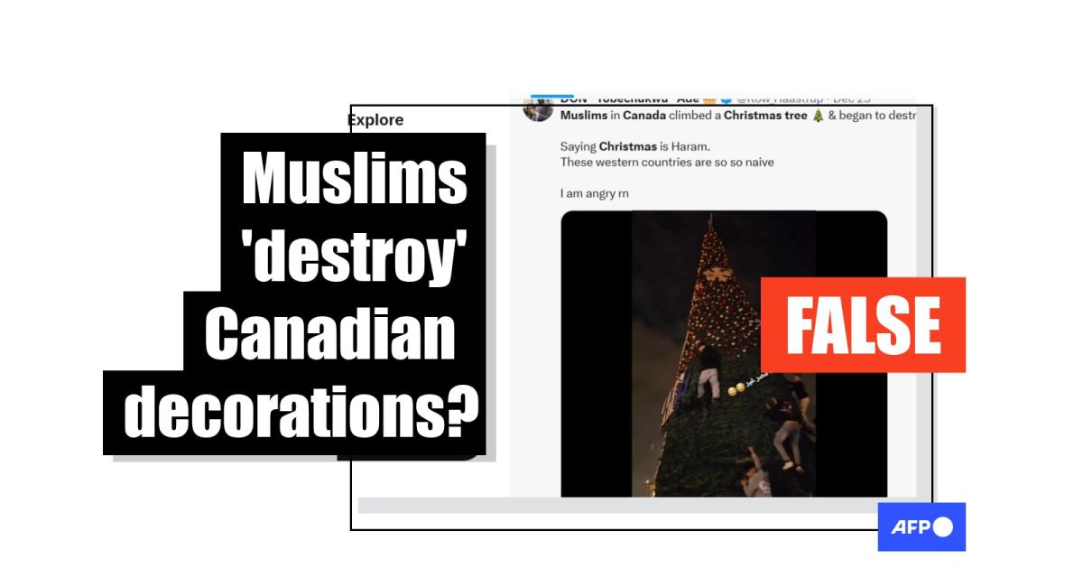 "Muslims in Canada climbed a Christmas tree & began to destroy it…" says the caption on a December 23, 2025 video on X.