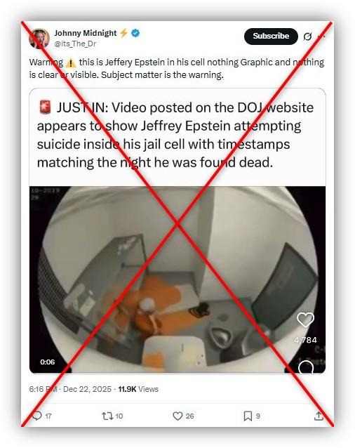 "JUST IN: Video posted on the DOJ website appears to show Jeffrey Epstein attempting suicide inside his jail cell with timestamps matching the night he was found dead," says text over a version of the 12-second video shared December 22, 2025 on X.