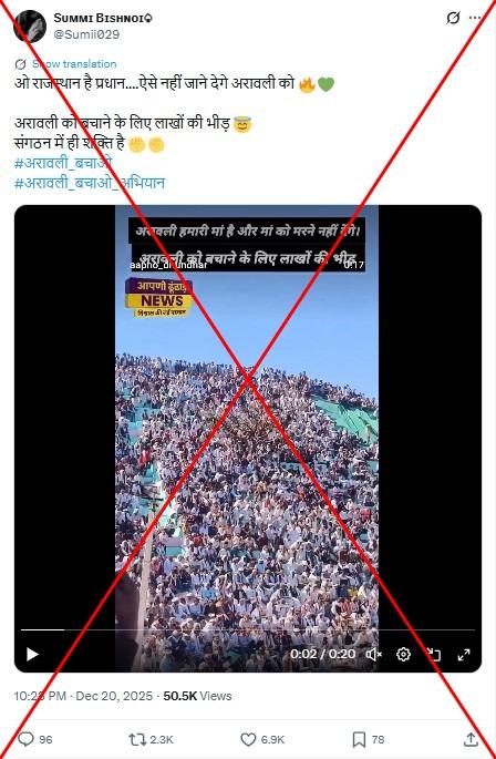 "A crowd of millions to save the Aravalli hills! There is strength in unity," reads part of the Hindi-language X post shared on December 20, 2025.