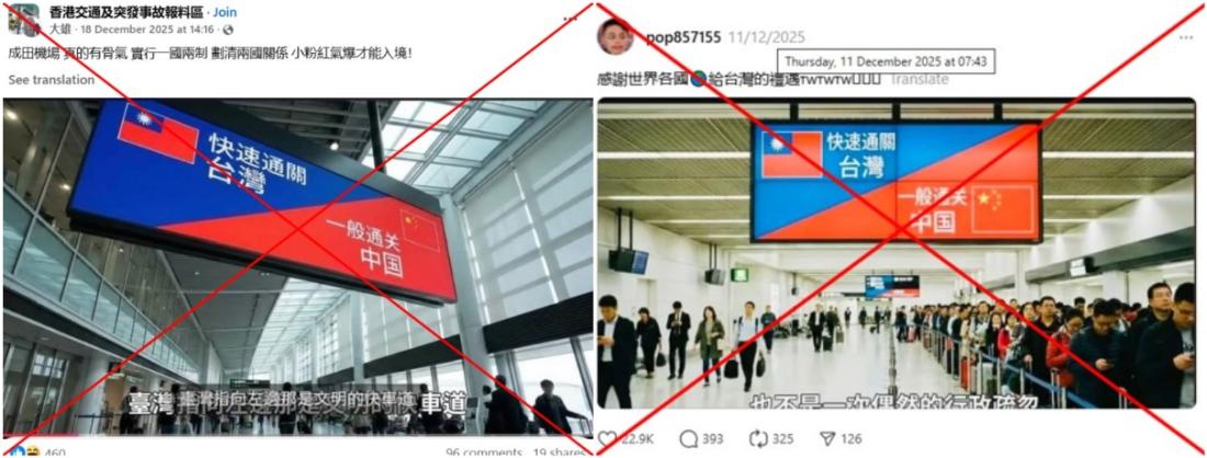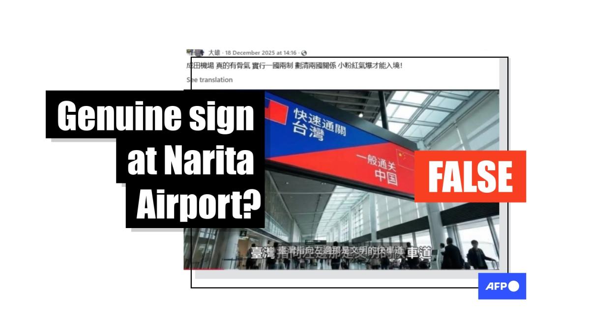 Tensions between Tokyo and Beijing remain high after Japanese Prime Minister Sanae Takaichi expressed support for Taiwan in November 2025. Social media posts shared fabricated images of signboards at Japan's Narita International Airport that appear to direct travellers from "Taiwan" and "China" to separate lanes for immigration clearance, falsely claiming Taiwanese people enjoyed preferential treatment when entering Japan. Tokyo's immigration services told AFP no such clearance channels exist and the images were generated using Google's AI tools.