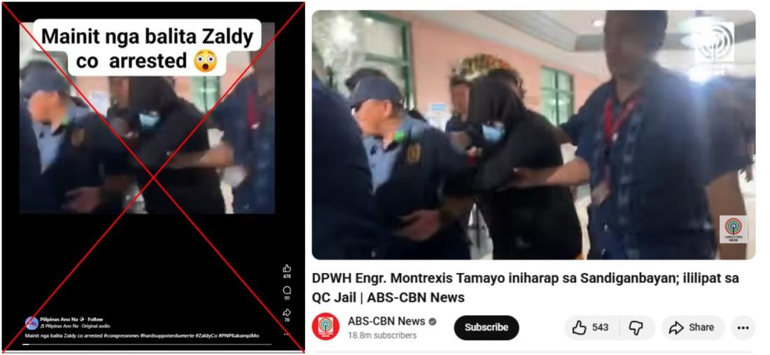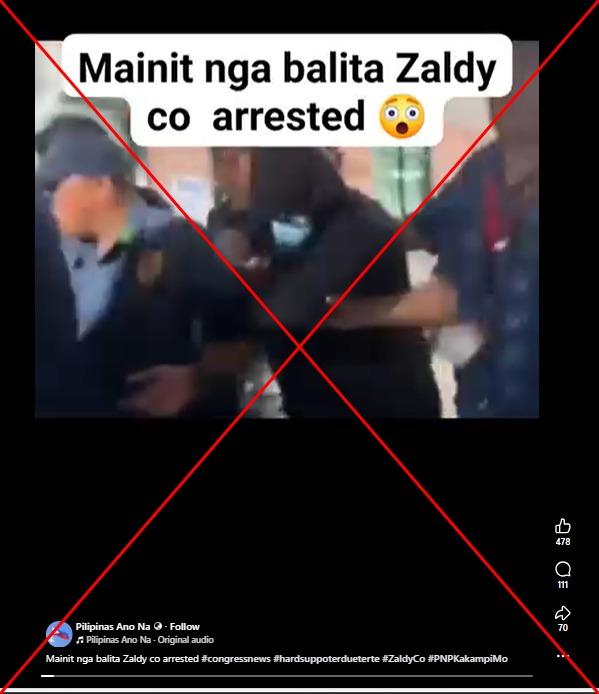 Philippine police issued an arrest warrant for former congressman Elizaldy Co on graft charges related to a major flood control project scandal in November 2025, but a video circulating on social media does not show him being apprehended. Local authorities told AFP Co has not been arrested and remains outside the country. The footage in fact shows another suspect in the graft scandal being escorted to court.