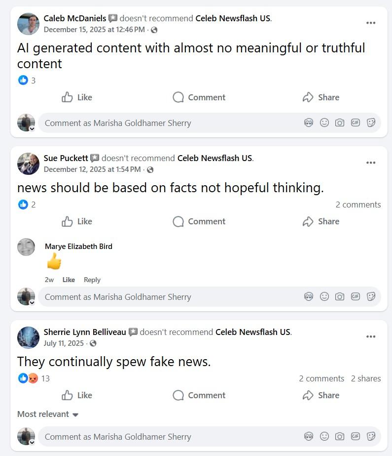 The Facebook pages that promoted such content have names including Celeb Newsflash US and contain reviews complaining about false and AI-riddled content (archived here).