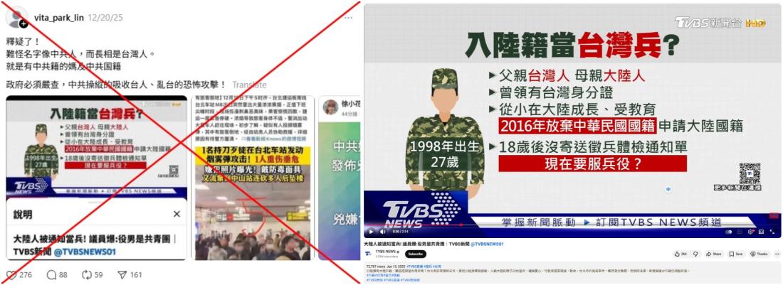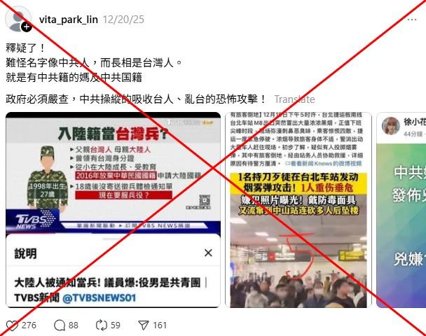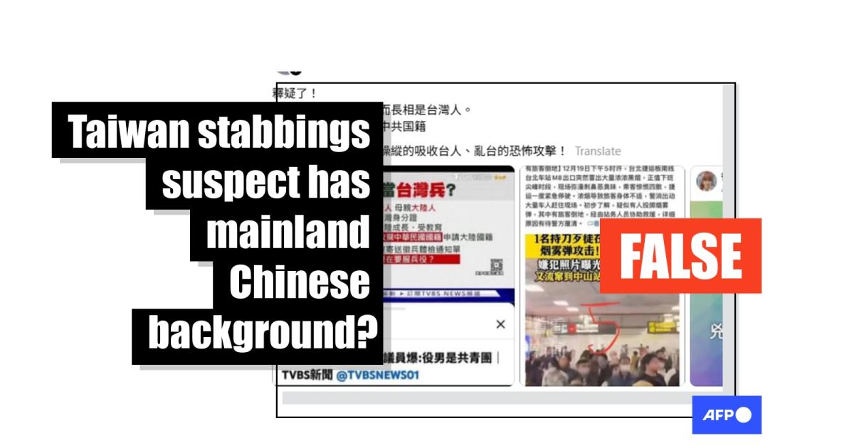 After three people were killed in a stabbing rampage in Taipei in December 2025, a graphic from a months-old news report circulated online with a false claim it was proof that the assailant had a Chinese mother and that he held a residency permit in the mainland. Taipei's top China policy body said this is "false information" and the report was in fact about a dispute over a drafting order given to a man who had given up his Taiwanese citizenship.