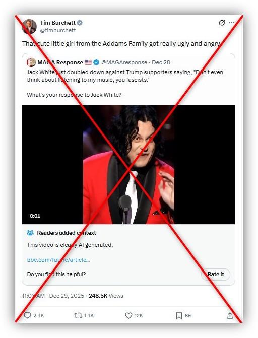 US Congressman Tim Burchett shared a video on X purporting to show American rock musician Jack White calling Donald Trump supporters "fascists" and demanding that they stop listening to his music. But while White has been an outspoken critic of the president, the clip Burchett amplified was generated by artificial intelligence, the rocker said on Instagram.