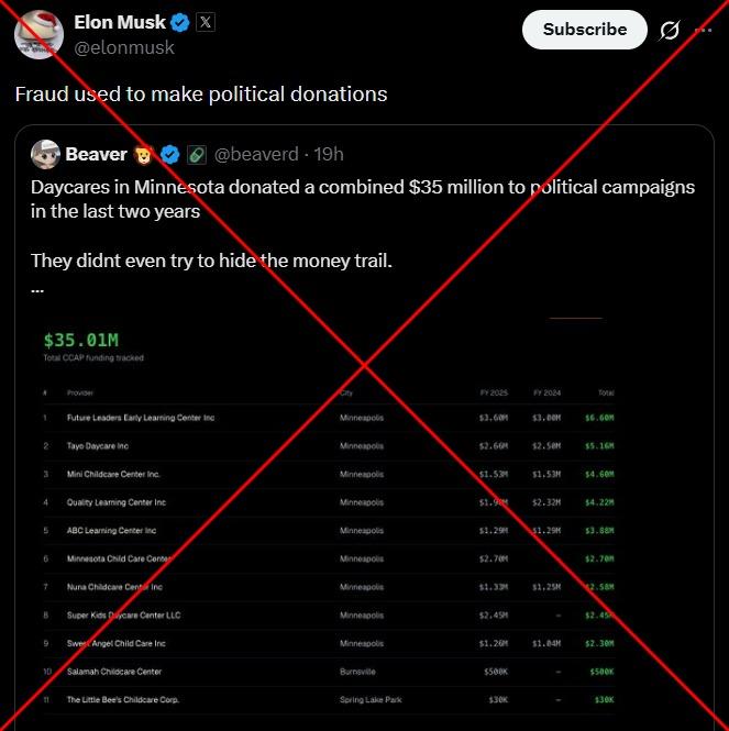 "Daycares in Minnesota donated a combined $35 million to political campaigns in the last two years," says a January 1, 2026 post on X. "They didnt even try to hide the money trail."