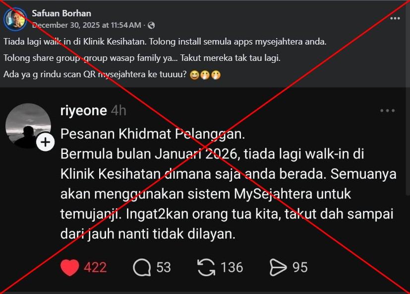 "No more walk-ins at government clinics," reads part of a Malay-language Facebook post shared on December 30, 2025.