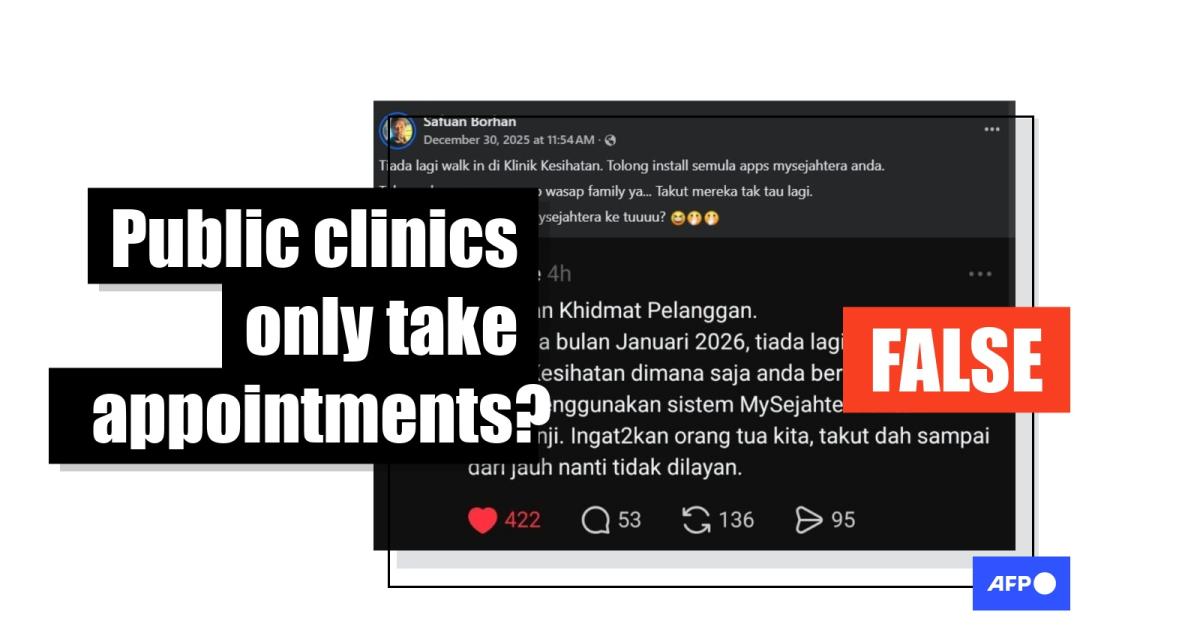 Malaysia's health ministry encourages the public to make appointments before visiting government-run clinics to reduce overcrowding, but social media posts claiming the clinics no longer accept walk-in patients are false. Authorities have denied the claim and a government-run clinic told AFP walk-ins are still accepted.
