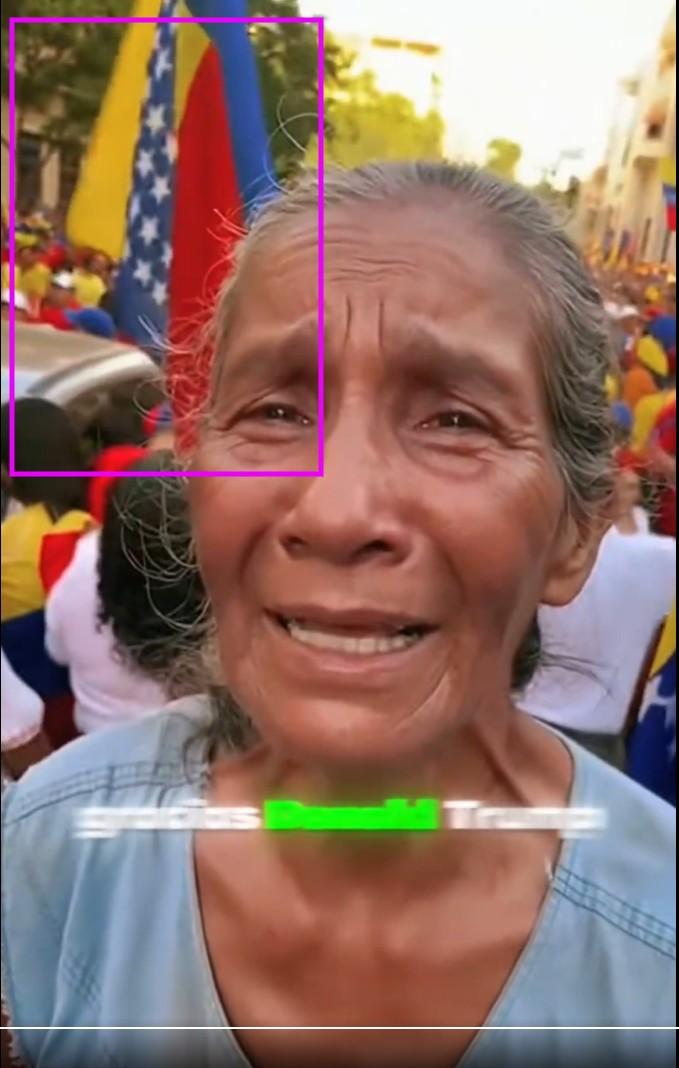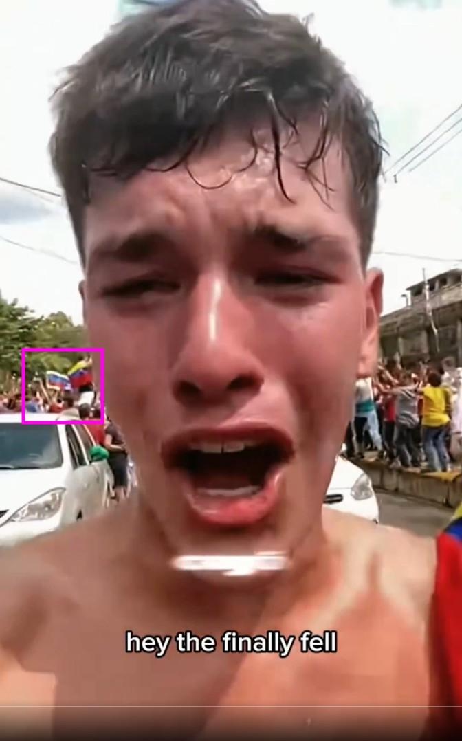 The clip appears to show a compilation of emotional people surrounded by Venezuelan flags who speak in Spanish about being "finally free."