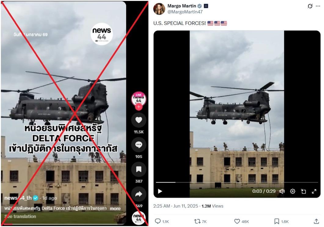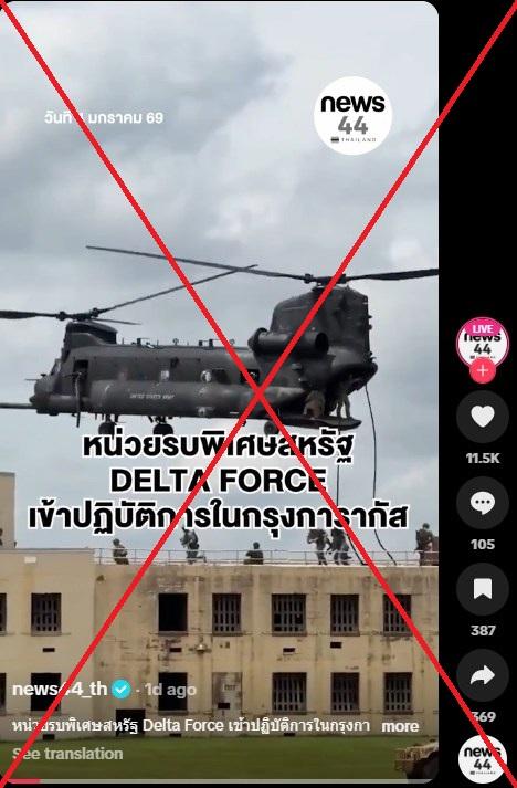 "US Army special unit DELTA FORCE launched an operation in Caracas," reads Thai-language text overlaid on a TikTok video of soldiers fast-roping from a helicopter onto a building, referring to the operators assigned to capture Maduro (archived link).