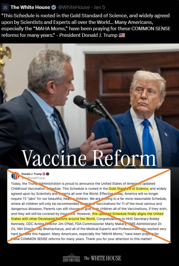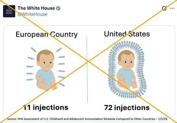 As the dramatic shift was announced on January 5, 2026 the White House shared a graphic on X alongside a screenshot of a Truth Social post from Trump that falsely claimed the United States previously required "72 jabs" for children in contrast to just 11 in Europe.