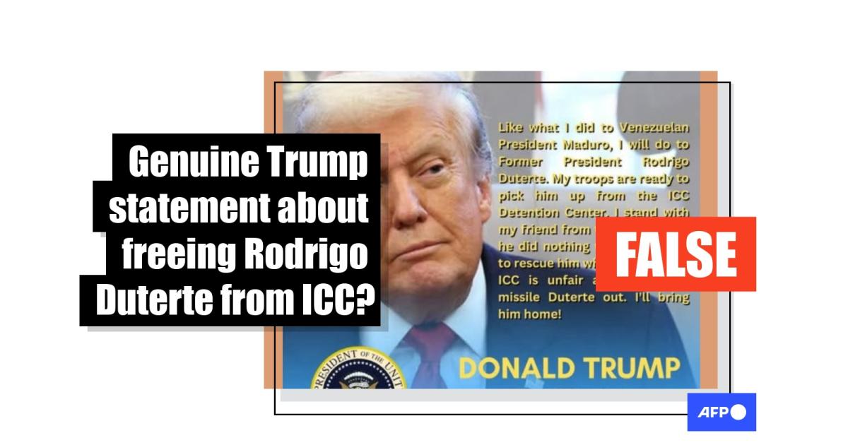 After Donald Trump launched a lightning operation to topple Venezuela's Nicolas Maduro, rumours surfaced online that the US president announced he would next free former Philippine leader Rodrigo Duterte from detention at the International Criminal Court (ICC). The graphic shared in the posts bears no resemblance to official statements released by the White House, and there was no record of Trump issuing such remarks on his social media.