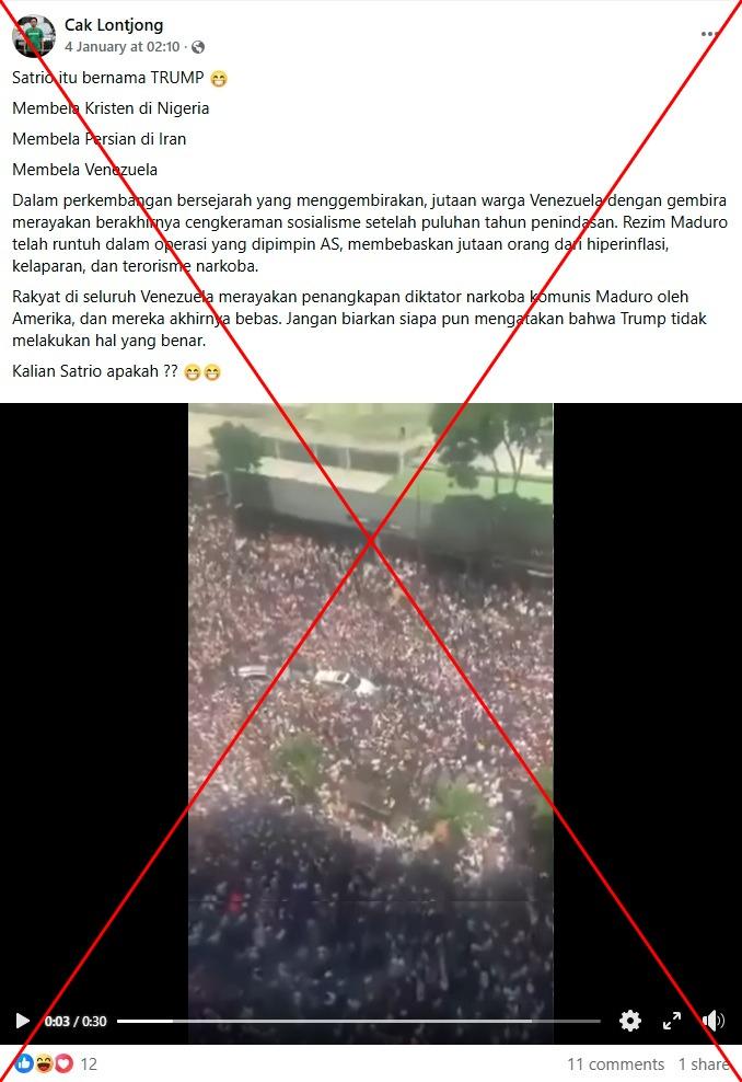 "The people across Venezuela are celebrating the arrest of the communist narco-dictator Maduro by America, and they are finally free," reads part of the Indonesian-language caption of a Facebook video shared on January 4, 2026.