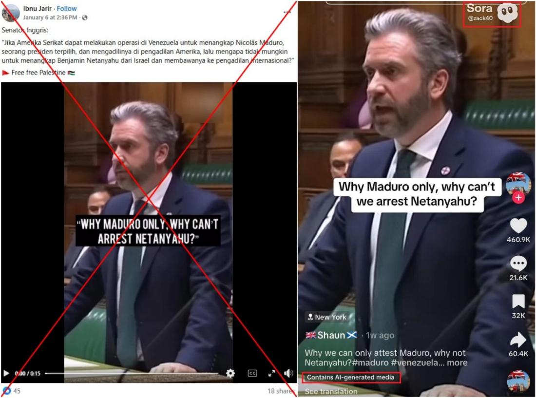 After Venezuelan leader Nicolas Maduro was seized by US special forces, an AI-generated video was shared in posts falsely claiming it showed a member of parliament in the United Kingdom asking why it was considered "impossible" to capture Israel's leader and bring him to an international court. The video contains visual errors indicative of AI-generated content, and other posts sharing the clip did not conceal a watermark for OpenAI's text-to-video tool Sora.