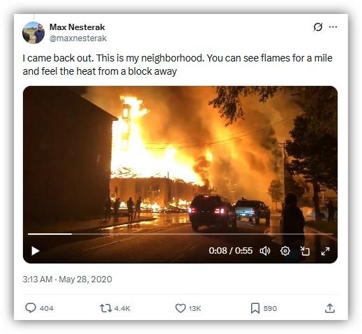 Reverse image searches traced the footage to a May 28, 2020 X post from Max Nesterak, a journalist for the Minnesota Reformer (archived here). Nesterak posted it as part of a thread describing scenes on the ground in the city through May 27, 2020 and into the early-morning hours of May 28, 2020.