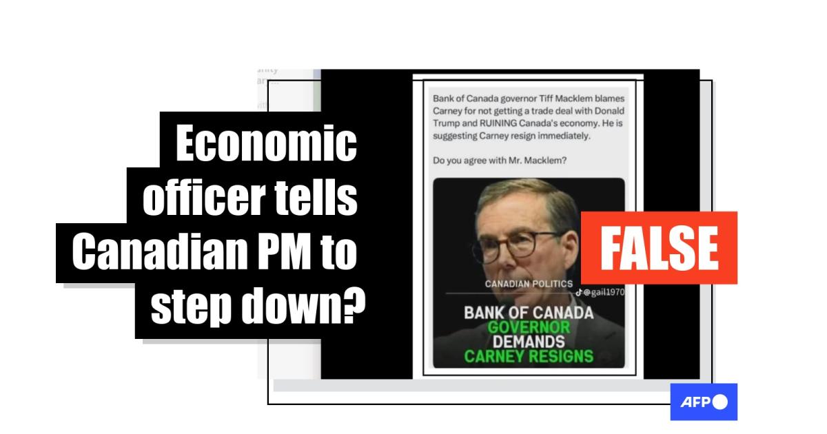 Canada's economy has teetered from the impact of US tariffs, but there is no evidence that Bank of Canada Governor Tiff Macklem has called for Prime Minister Mark Carney to step down, as claimed in posts across social media. The Bank of Canada confirmed to AFP that its top official made no such demand.