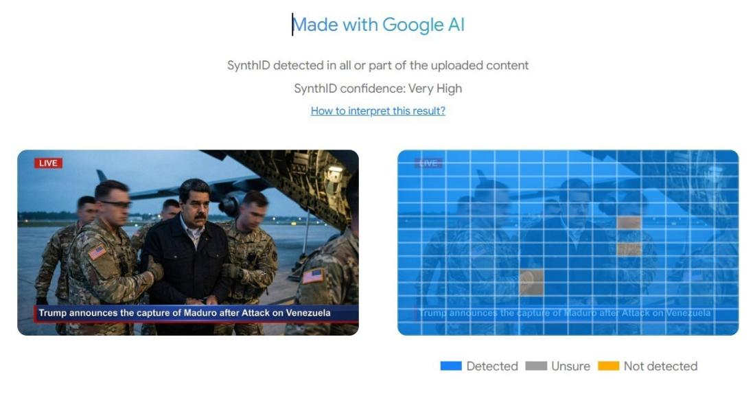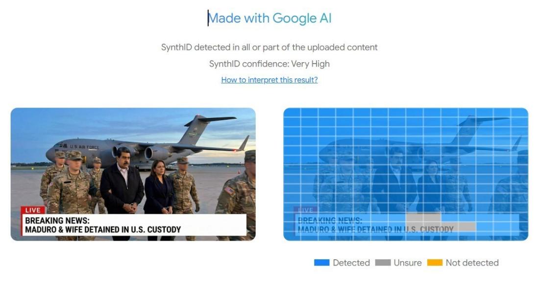 A subsequent analysis conducted with Google's SynthID tool -- launched in May 2025 to detect AI-generated content -- identified with a "Very High" degree of confidence that the images were created with the help of its AI tools (archived link).