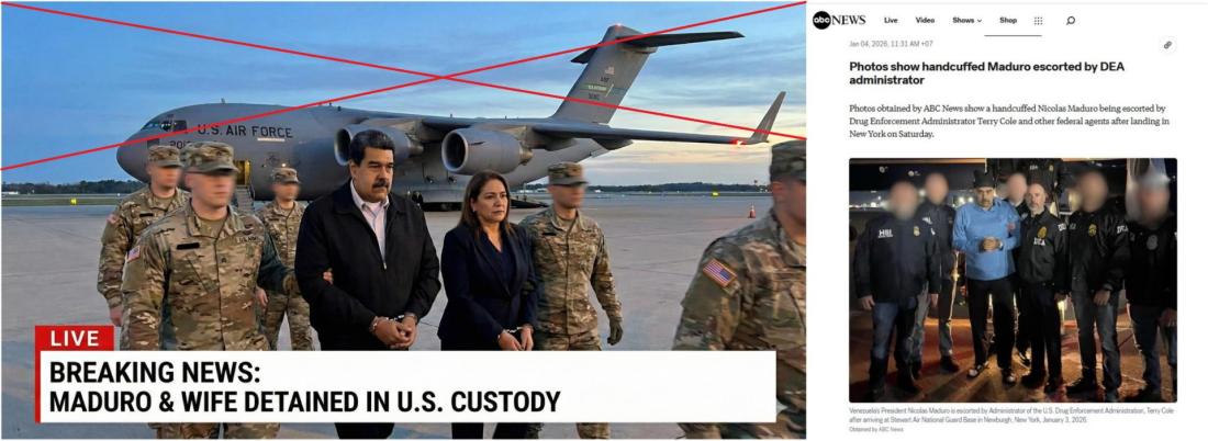 Two images -- one showing the ousted president and his wife in handcuffs, surrounded by soldiers and a supposed US Air Force aircraft in the background, while the other only shows Maduro being escorted -- were shared in a Burmese-language Facebook post on January 3, 2026.