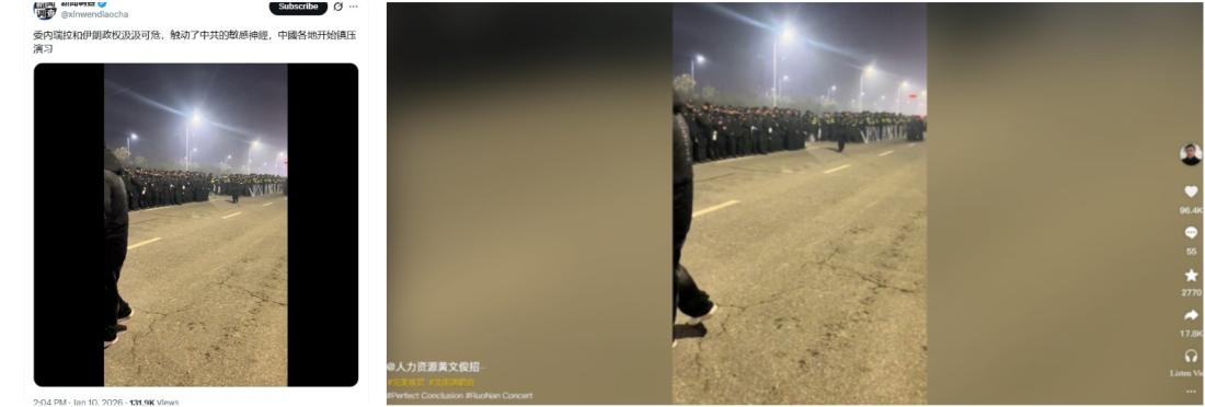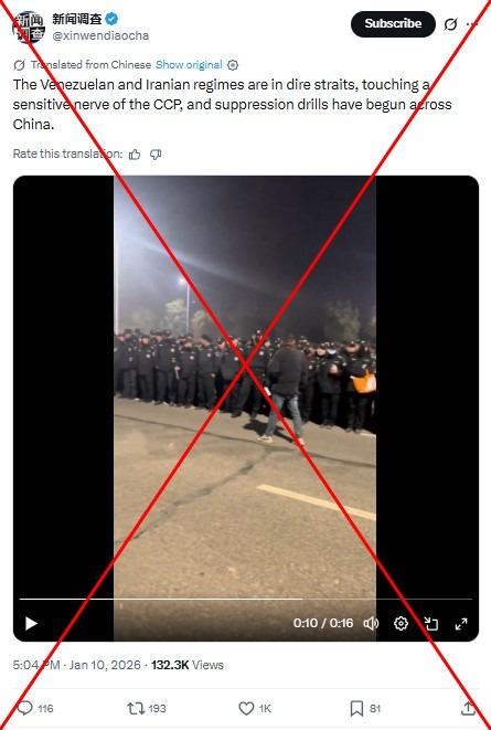 However, the video does not depict a crackdown drill, and there have been no official reports indicating that Chinese authorities have conducted nationwide suppression exercises linked to the recent unrest in Venezuela and Iran.
