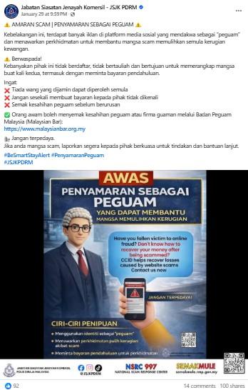 The post reminds users there is no guarantee money lost to scams can be recovered, and urges them to verify the legitimacy of a lawyer through the Malaysian Bar Association.