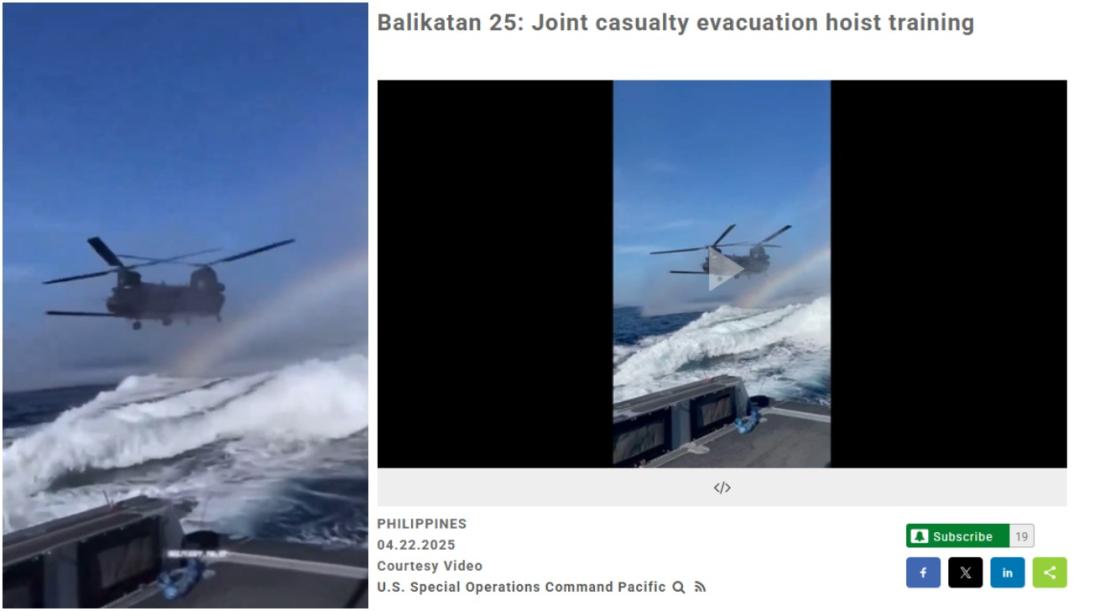 The caption of the June 6, 2025 post says the video shows a "casualty evacuation exercise" in the Philippines' Subic Bay, as part of "Exercise Balikatan 25".