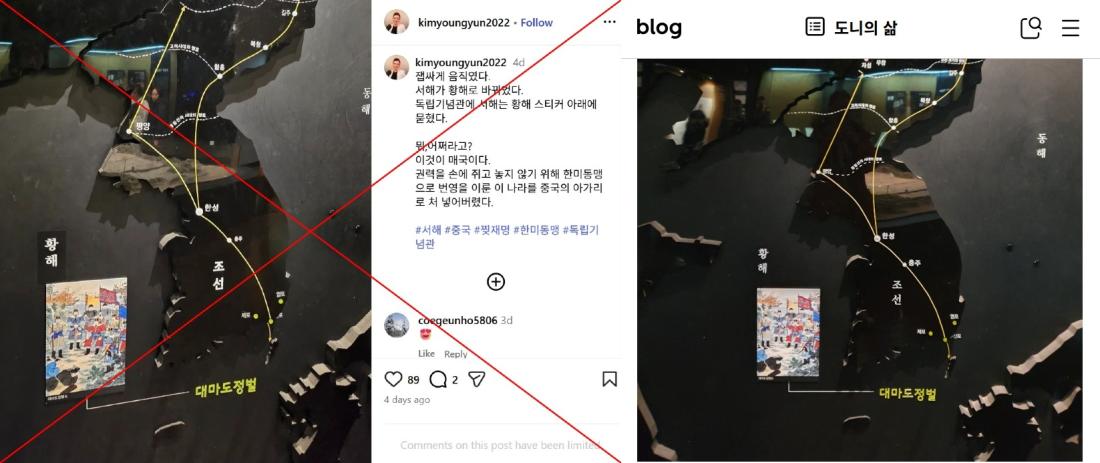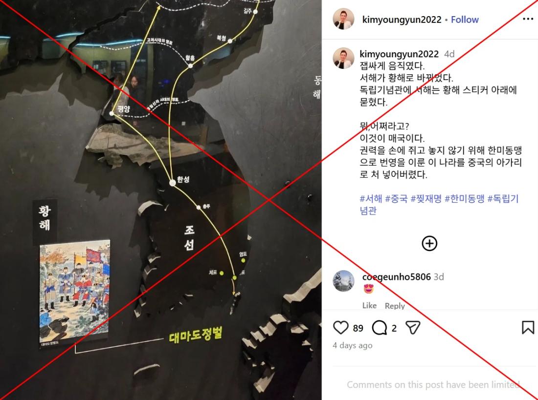 "At the Independence Hall, a sticker reading Yellow Sea has covered up the term West Sea," reads part of the Korean-language caption of an Instagram photo shared on January 10, 2026.