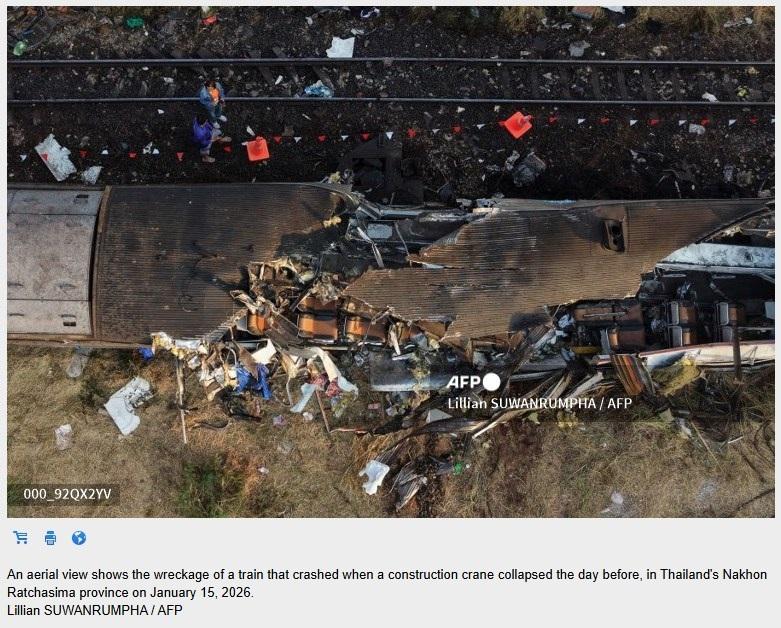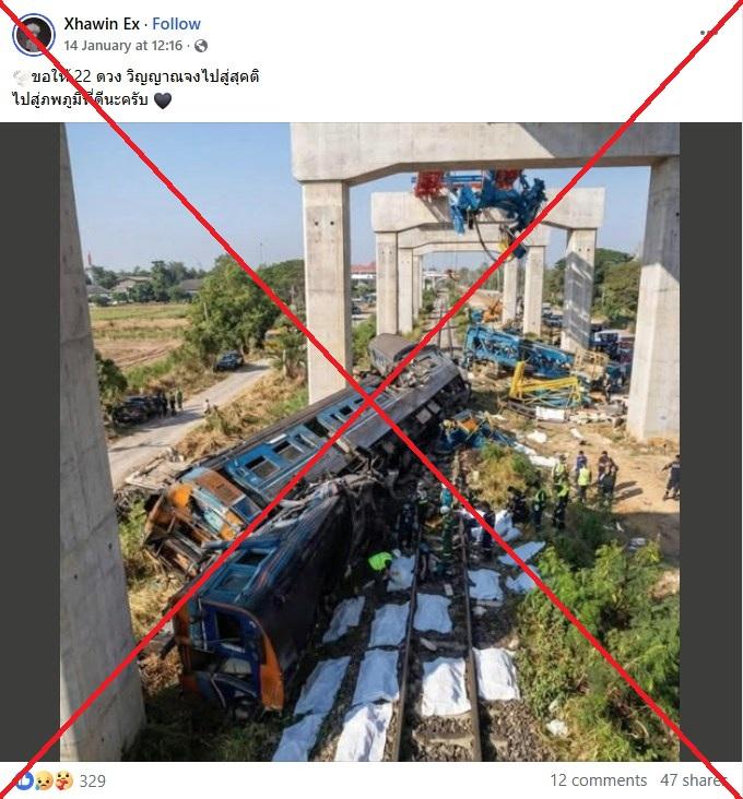 It circulated after a construction crane used for assembling a high-speed rail bridge collapsed onto a passing passenger train in northeastern Nakhon Ratchasima province on January 14, killing at least 32 people and injuring 66 others (archived link).