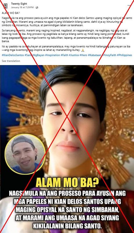 "DID YOU KNOW? The process to have Kian delos Santos recognised as an official saint of the Church has already begun, and many are hoping he will be officially acknowledged as a saint soon," reads a Tagalog-language Facebook graphic that racked up more than 2,600 shares.