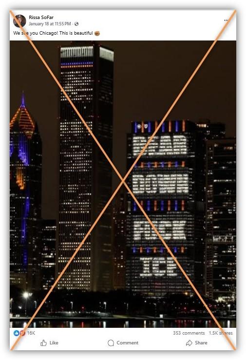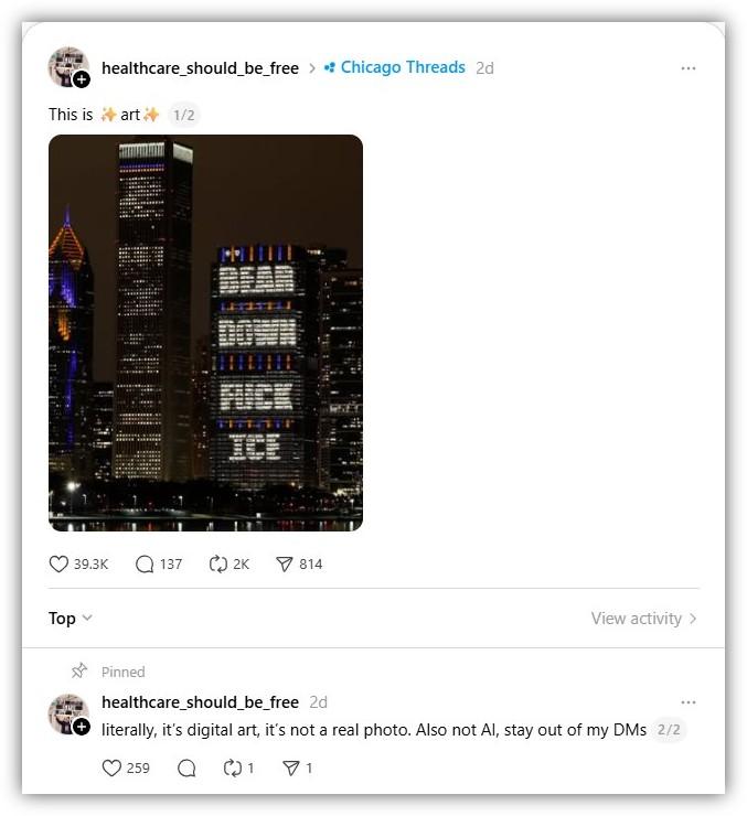The image -- which shows a building's windows lit up to cheer the Chicago Bears and curse ICE -- also circulated across Instagram, Threads and X.