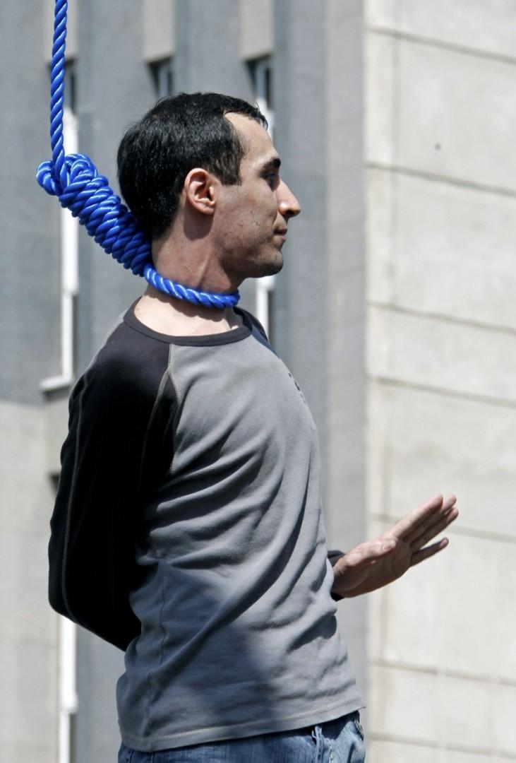 The collage shows three photos of a man grinning and waving despite his hands being tied behind his back and having a blue noose around his neck.