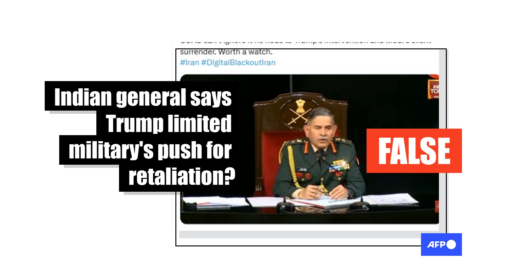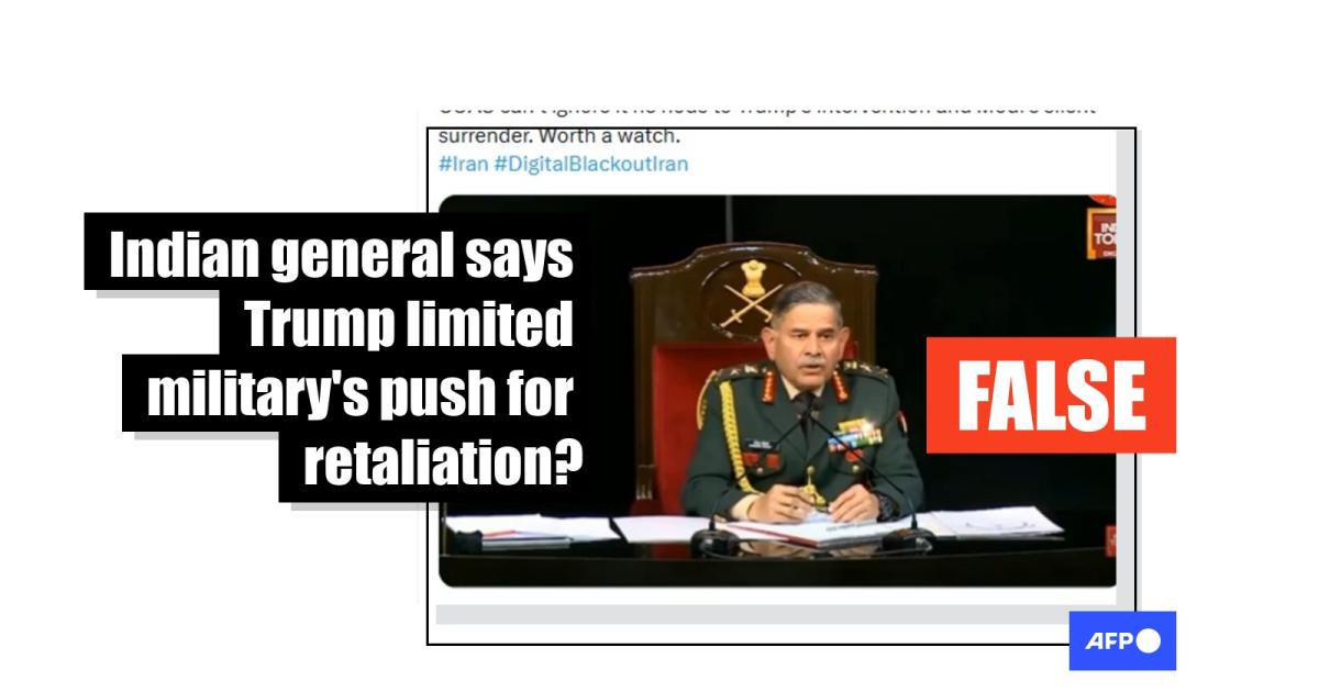After India's army chief said an operation launched against Pakistan in May 2025 is still ongoing, despite the nuclear-armed neighbours agreeing to a ceasefire, a manipulated video was shared in posts falsely claiming it showed him saying an intervention from US President Donald Trump "limited our ability to pursue further retaliation". The purported remarks contradict earlier statements from Prime Minister Narendra Modi that no world leader had pushed his country to stop fighting Pakistan. A review of the press briefing shows the video has been doctored to include the fabricated remarks, which appear to have been generated with the help of AI.