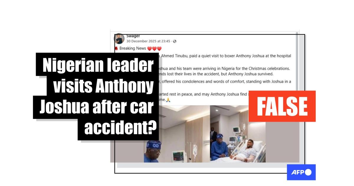 Professional boxer Anthony Joshua was injured in a car crash during a trip to his hometown in southwest Nigeria in late December 2025. Two of his close friends died. Soon after, images claiming to show Nigeria’s President Bola Tinubu visiting Joshua in the hospital circulated on social media. However, the claim is false; the images were digitally created using artificial intelligence (AI) tools. Tinubu was not in the country at the time.