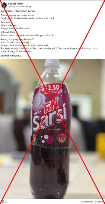 "SARSI CAN GET RID OF COUGH. Since then, whenever I cough, I don't bother buying cough syrup anymore. I just grab some sarsi, boil it for a bit, let it cool down… then drink it.," reads part of a Malay-language Facebook post on January 22, 2026.