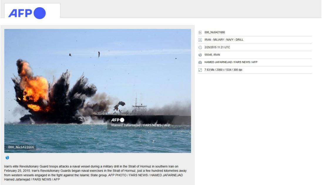 “Iran's elite Revolutionary Guard troops attacks a naval vessel during a military drill in the Strait of Hormuz in southern Iran on February 25, 2015. Iran's Revolutionary Guards began naval exercises in the Strait of Hormuz, just a few hundred kilometres away from western vessels engaged in the fight against the Islamic State group,” the caption reads.