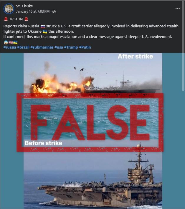 “Reports claim Russia struck a U.S. aircraft carrier allegedly involved in delivering advanced stealth fighter jets to Ukraine this afternoon. If confirmed, this marks a major escalation and a clear message against deeper U.S. involvement,” reads the caption of a Facebook post shared on January 16, 2026.