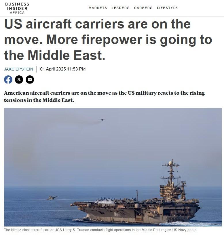 “US aircraft carriers are on the move. More firepower is going to the Middle East,” the headline reads.
