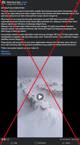 "Snow apocalypse in Kamchatka," reads part of the lengthy Malay-language caption of a Facebook video shared on January 20, 2026.