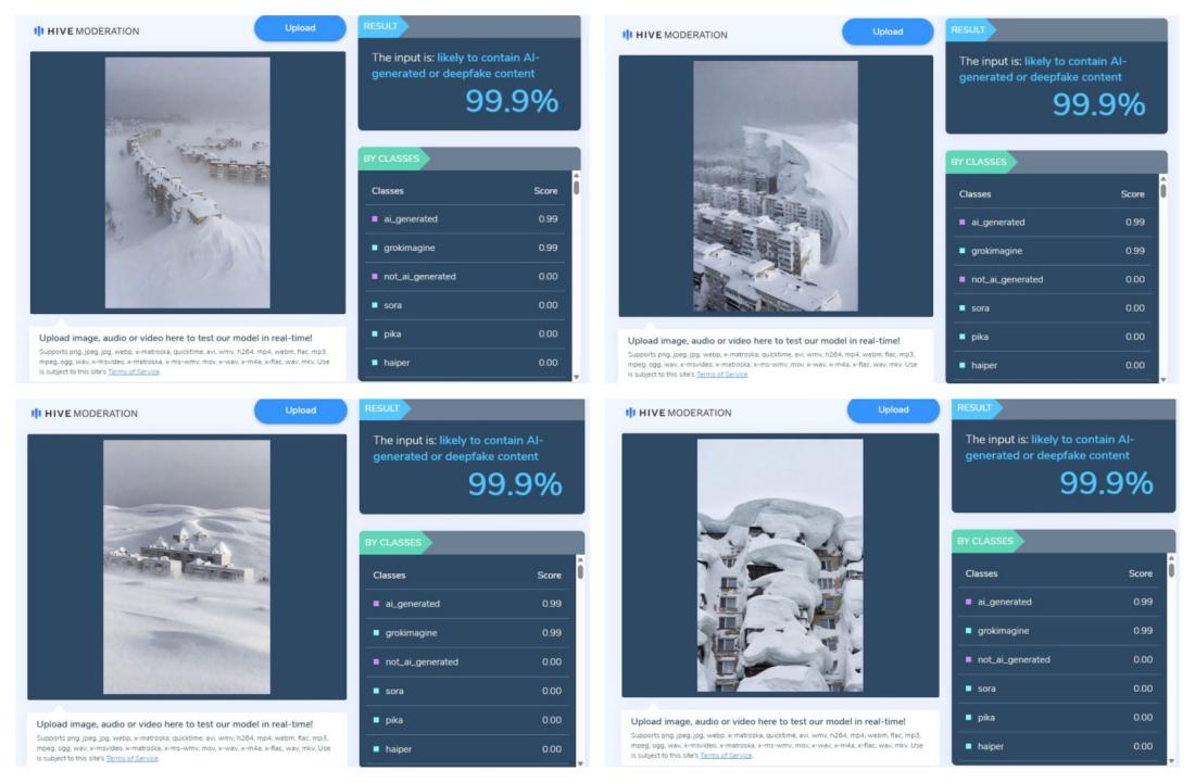 An analysis of the four clips comprising the falsely shared video using the Hive Moderation detection tool found they were "likely to contain AI-generated or deepfake content" (archived link).