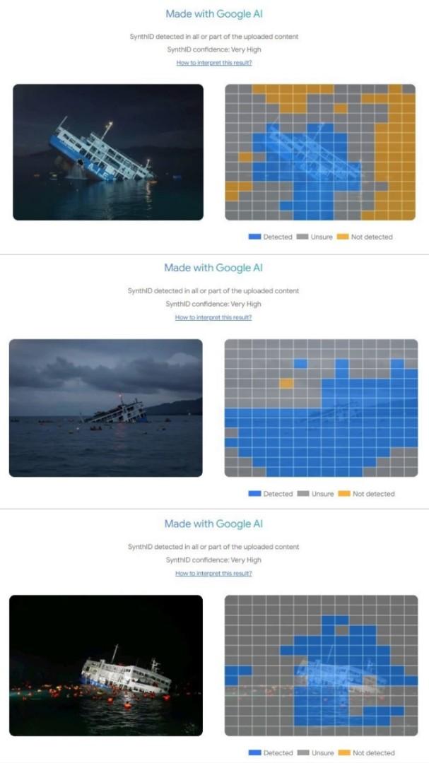 AFP uploaded the images through Google's SynthID detector, a tool designed to identify AI-generated content, which returned with a "very high" degree of confidence that they were created using the company's AI tools (archived link).